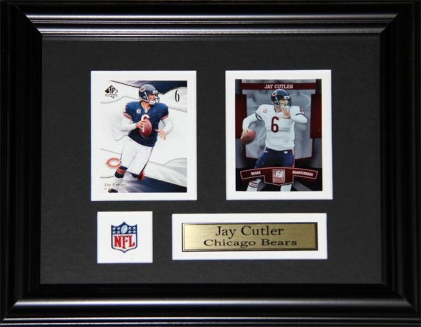 Double card set featuring Jay Cutler on the Chicago Bears. Comes framed with matting, plaque, and collector pin.