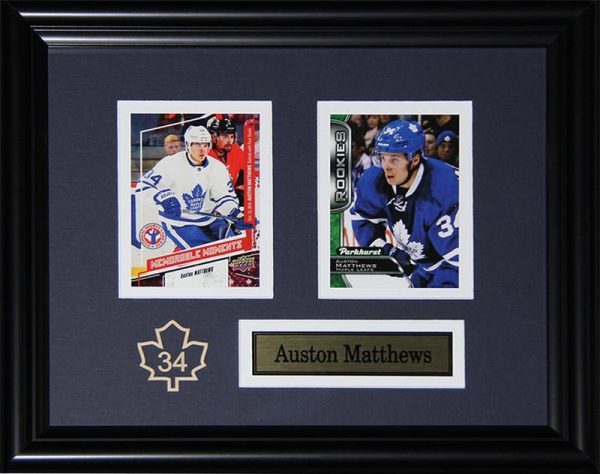 Double card set featuring Auston Matthews on the Toronto Maple Leafs. Comes framed with matting, plaque, and collector pin.