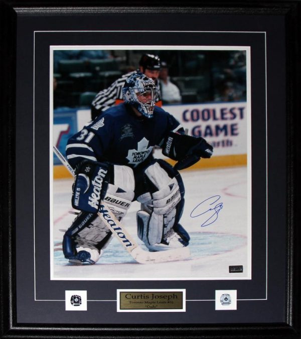16×20 signed photograph featuring Curtis Joseph on the Toronto Maple Leafs. Comes framed with matting, plaque, collector pins, and Certificate of Authenticity.