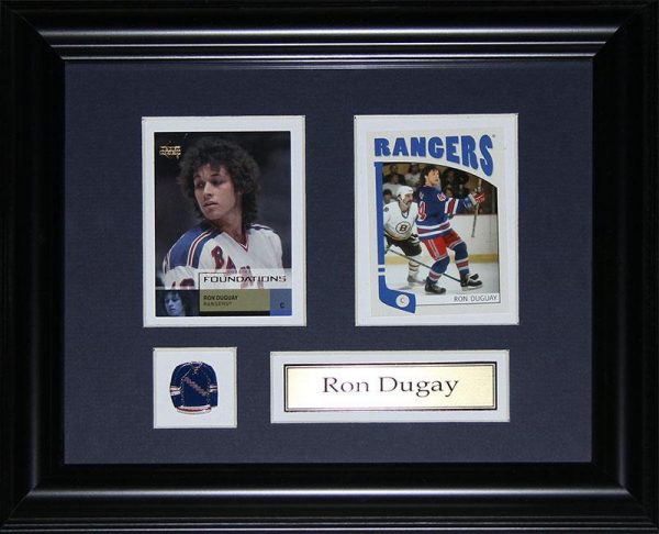 Double card set featuring Ron Dugay on the New York Rangers. Comes framed with matting, plaque, and collector pin.