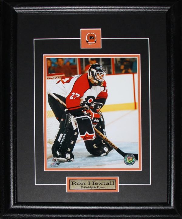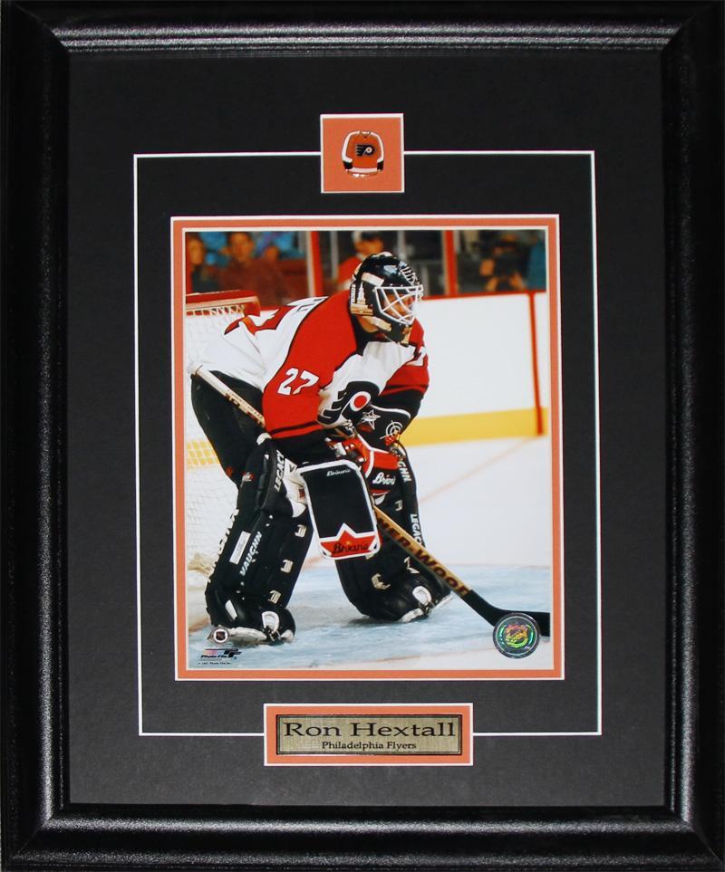 8×10 photograph featuring Ron Hextall on the Philadelphia Flyers. Comes framed with matting, plaque, and collector pin.