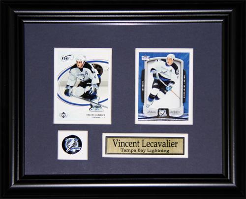 Double card set featuring Vincent LeCavalier on the Tampa Bay Lightning. Comes framed with matting, plaque, and collector pin.